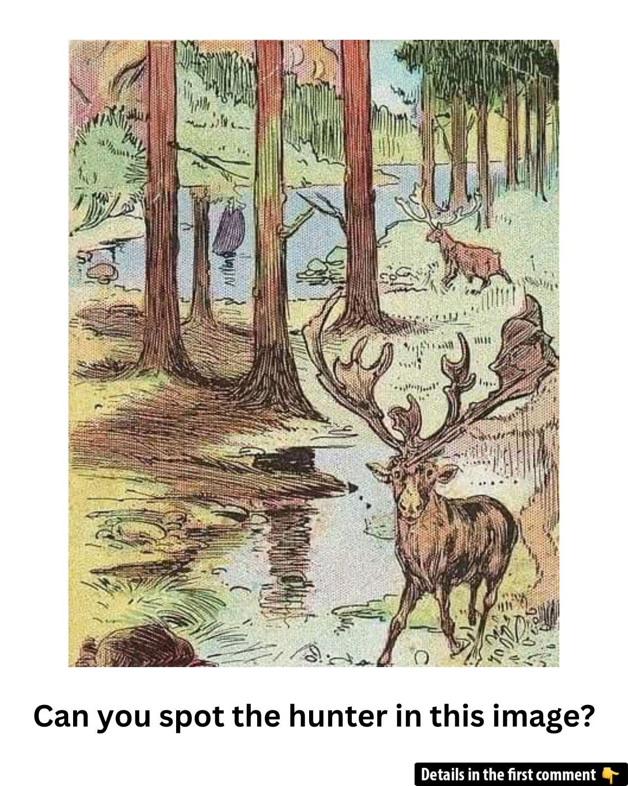 At first glance, this beautiful forest scene might seem peaceful, with a deer calmly strolling by the water. However, hidden within the scene is a hunter. Can you spot where the hunter is? This optical illusion puzzle will test your observation skills. Take a closer look at the image and see if you can find the hunter camouflaged among the trees. Ready to give it a try?