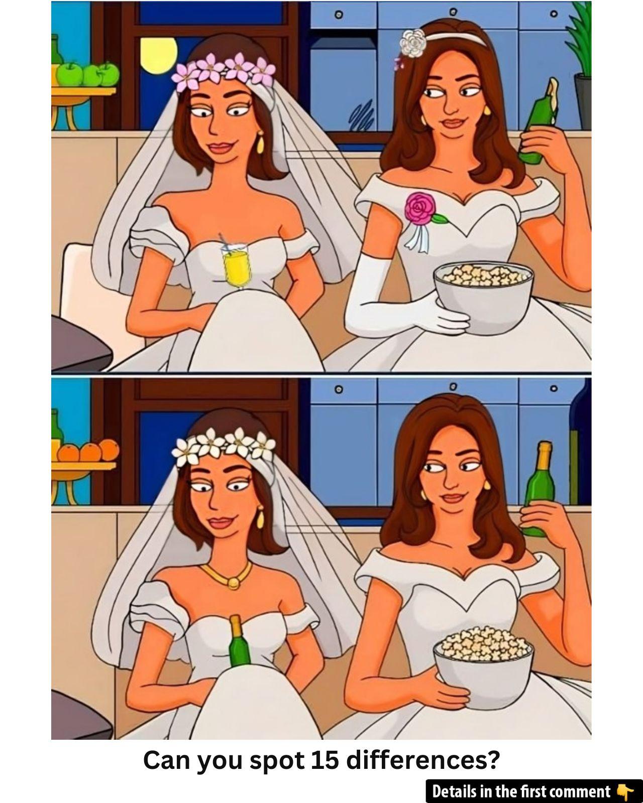 Think you’ve got the sharpest observation skills? Below are two nearly identical snapshots of a bride and her maid in a cozy evening setting. At first glance, you might see only the elegant gowns and soft lighting—but hidden among the furniture, décor, and accessories are 15 subtle differences. Ready to challenge yourself? Pause, compare both images carefully, and see how many variations you can uncover before scrolling down for hints and explanations!