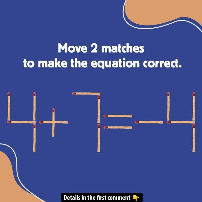 Here’s a tricky matchstick puzzle to test your problem-solving skills! The equation 4 + 7 = 4 may seem impossible to solve at first, but with a simple twist, you can make it correct by moving just two matchsticks. Can you figure out how? It’s not about math—it’s about using your creative thinking to manipulate the matchsticks and turn the equation into something valid. Read on to see the solution and share your answer with us in the comments. Ready to challenge yourself further with more puzzles? Let’s get started!